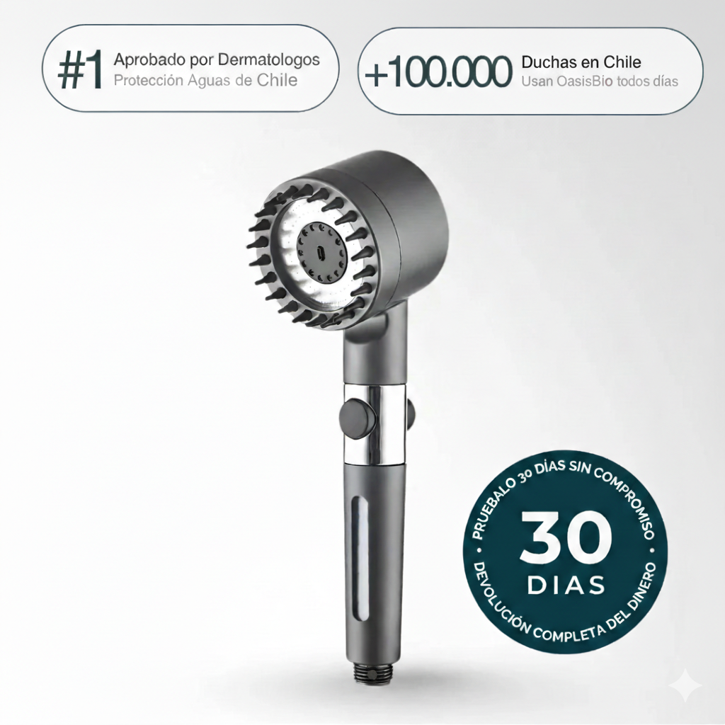 Desarrollada por el Dr. Robert Campos, OasisBio incorpora un sistema único de filtración de 3 etapas que elimina lo que los demás no pueden: cal, cloro, metales pesados y microplásticos.